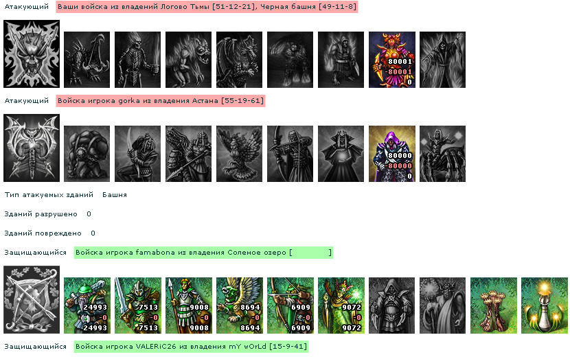 Итак допустим соленка торчала на священной земле (не нашим, не вашим) ... защиту за чж воткнули ... башни обычная 3-й уровень, магбашня 2-й ... дамаг пробивает средний ... задача стоит наказать наиболее эффективно ... пробой руиной в размере 60К наймов я добавил к атаке темного эльфа понятно на самом деле дамага было на 30-50% меньше ...Denis писал(а):Grambler писал(а):потому что простая подстава только со стороны 2-ух подмог убивает 3 волны наймов включая миллионника .... вот цифры оставления части армии со стороны тэ и демона ... атака бьет максимум ...