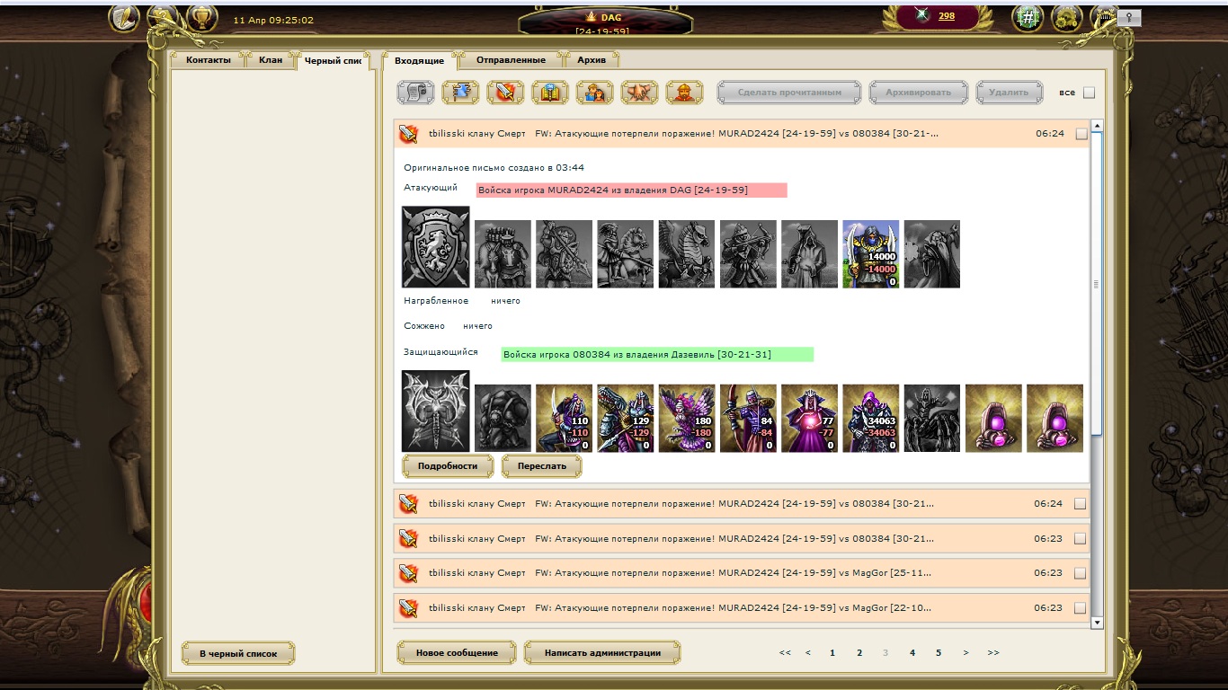 Ну, а дальше - поиски жертв, атаки на все предполагаемые цели (включая Мурада и Олега). Бодрый занос меня в храм до 7 апреля Олегом и Мурадом, слив нескольких сюзеренов Смерти мной и 080384, выжидание и частичный слив Олега 080384.