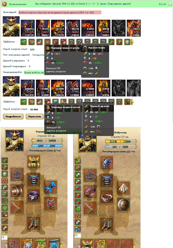 сильнее? Дисбаланс в свитках и артах. С помощью которых из армии делается непробиваемый танк. А дмг-решают луки. Если да же к логу добавить 500к наймов в оборонку. Это мало что изменило бы. + магов не было у атака. А это- можно было бы в ноль выйти.Nightworld писал(а):Denis, а в чём на ваш взгляд дисбаланс? Что стратег как боевой герой получился намного сильнее всех остальных? так это вроде так и задумано...