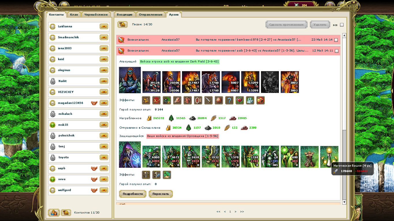 После обкаста бонус на атаку имели только луки у обоих +30% (ярость луков 5го), остальные бонусы/дисбонусы нивеллированы свитками и артами. Броня атакуемого срезана с 65 до 20, моя броня 70. Атака магичек обрезана на 40%. Обкаст на здоровье был +60% базовый от героя+арты, свитки на здоровье были всем 80-100%, кроме самого главного - на носилок здоровья небыло :) Даже при этом, если бы достали наймов из подвала, то потери были бы равны примерно и я был к ним готов. Скрин 2й атаки на добивание выкладывать не буду, поверьте на слово что добил все.
