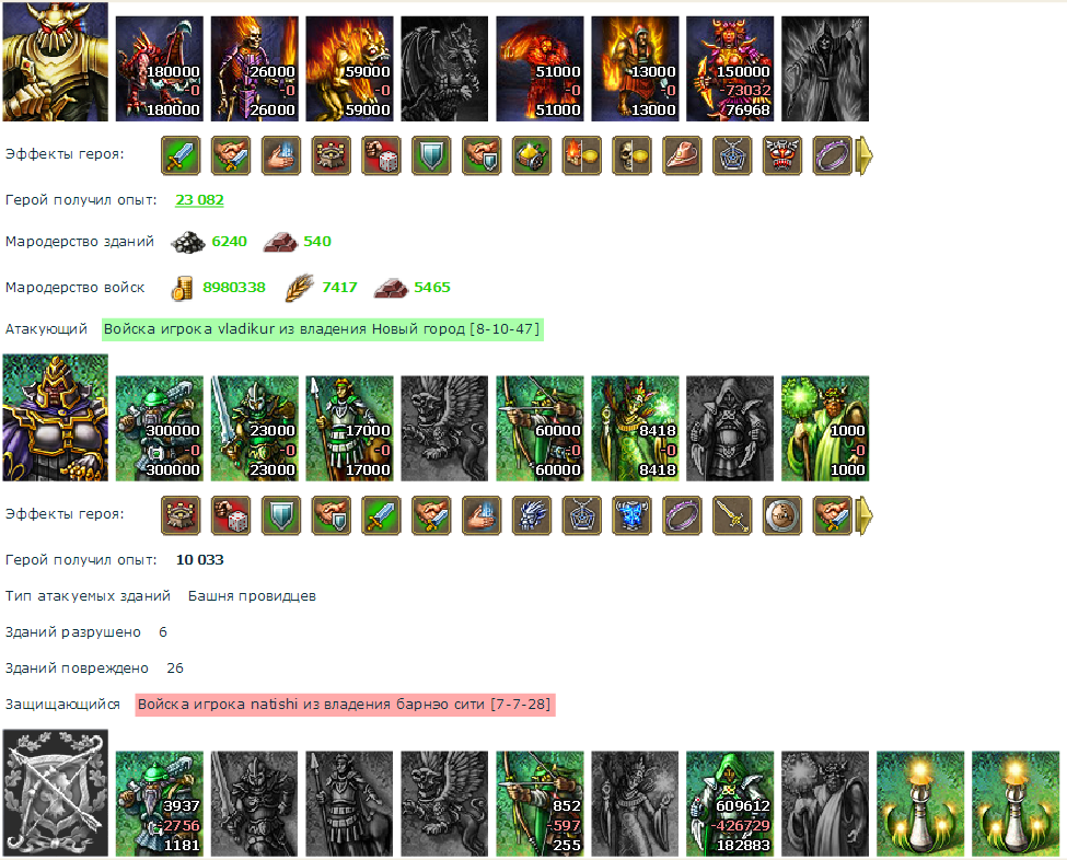 А теперь разберем ситуацию по полочкам. Во-первых. В атаку вышли три паладина с армией в двое больше выставленной подмоги. Просчитывали на кальке, победа однозначна, учитывая плохой обкаст героев подмоги и множества каках на самом замке и хороший обкаст героев атаки с артами на порядок лучше артов противника. Далее у моего героя был свиток осторожности, пришлось его использовать, т.к. шли вслепую, миссии не пробить. Учитывая вероятный исход боя, и присоединение третьего героя (общая атака противника было на -90, а предел максималки минус 25) отмены миссии не должно было произойти. Остается выяснить почему произошла отмена миссии: либо осторожность срабатывает при подсчете войск противника с учетом реальной армии, но тогда отмена не возможна, либо подсчет идет с учетом раздутой армии. Но при атаке все армии были раздуты, кроме армии кадабрика, она была скрыта условными обозначениями типа орда, тьма и т.д. Поскольку такие обозначения имеют буквенное значение, калькулятор мог выставить их в ноль, а это уже баг в чистом виде., т.к. и эти обозначения имеют свой числовой диапазон. Осталось разъяснить ситуацию у админов и выяснить как работает подсчет войск при свитке осторожности с раздутой или скрытой армией. Поэтому, товарищщщ макстор-рябцев, держи свои измышления при себе. Кстати, поздравояю с баном. пожаловалась на Не4то - явный мульт, а поймали и тебя в бан. И за клан не переживайте, армия Назара восстановится за 1, а если с ленцой - в 2 турнира. Никакого расстройства или депрессии эта атака не принесла. Учтем собственный опыт на будущее.