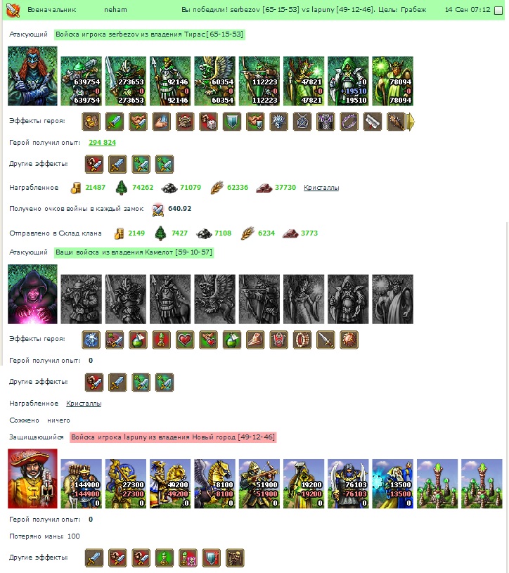 Подняли они воскрешением по 2кк найма, квестами, артами, свитками разогнали атаку. Спрятали под маскировкой армии, но спалились перед выходом (мы поймали момент, когда герои с раздутием были в подвале).