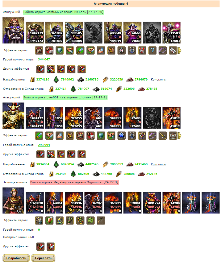 Ну теперь напишу я, то кто начал этот поход.Вышли мы сломать клан-склад мантикорам.И с этой точки зрения поход цель выполнил на 100%, учитывая 2-жды смену хозяина там мало что осталось.Теперь насчет невидимок, я вообще лёг спать отправив армию, ну стало меньше картинок, что в этом ужасного.Мне жалко людей пытающихся заработать здесь средства на жизнь.Так-что количество армии для меня лично не существенно, потеряв какую-то часть армии или даже 100% её я просто стану свободнее по времени, а вот оппонент, я боюсь с голоду рискует умереть, если правда, то что про него говорят. По поводу защиты в копи, с утра прислали шпионаж с копью герметика, там были только казармы луков.А вечером другая копь и там строится защита по полной, с чего бы это.Теперь отвечу neham.Почему то бой где он потерял более половины армии он называет подслили, а там где я треть потерял называет положил.