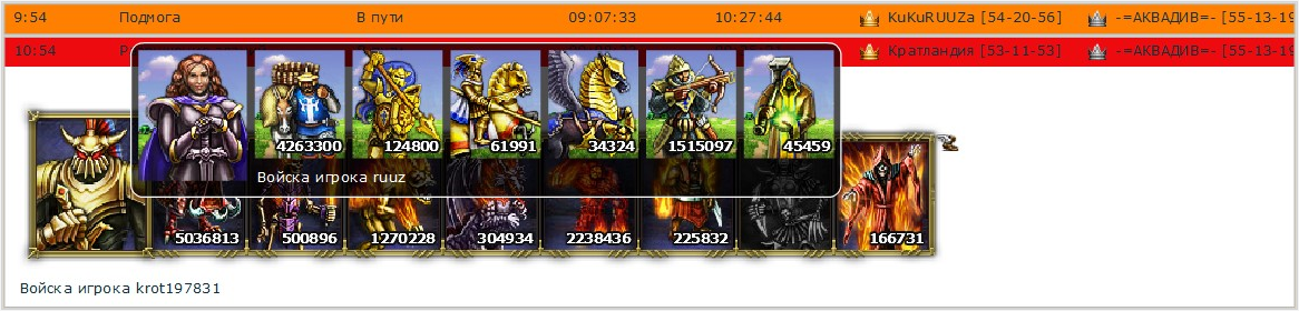А что выкладывать если половина пришельцев боятся всего??? я сегодня ходил выносить зеркала 7 лвл он сильние меня и переместил арму в тот город где рушил и снова побежал в столицу! или как ходил к игроку с того же клана грабить просто так там подмога шла и что обкастовался и пошёл! подмога отменилася за 4 минуты до боя!!! О каких битвах тогда можна говорить???Nichao писал(а):Когда начнете уже скрины боев покрупнее выкладывать?