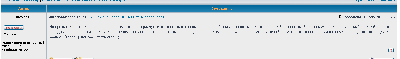 Не прошло и нескольких часов после комментария о раздутом эго и вот наш герой, наклепавший войско на боте, делает шикарный подарок на 8 лярдов. Мораль проста-самый сильный арт-это холодный расчёт. Верьте в свои силы, не ведитесь на понты гнилых людей и все у Вас получится, не сразу, но со временем-точно! Всем хорошего настроения и спасибо за шоу уже экс топу 2 с малыми (теперь) шансами стать стоп 1;)