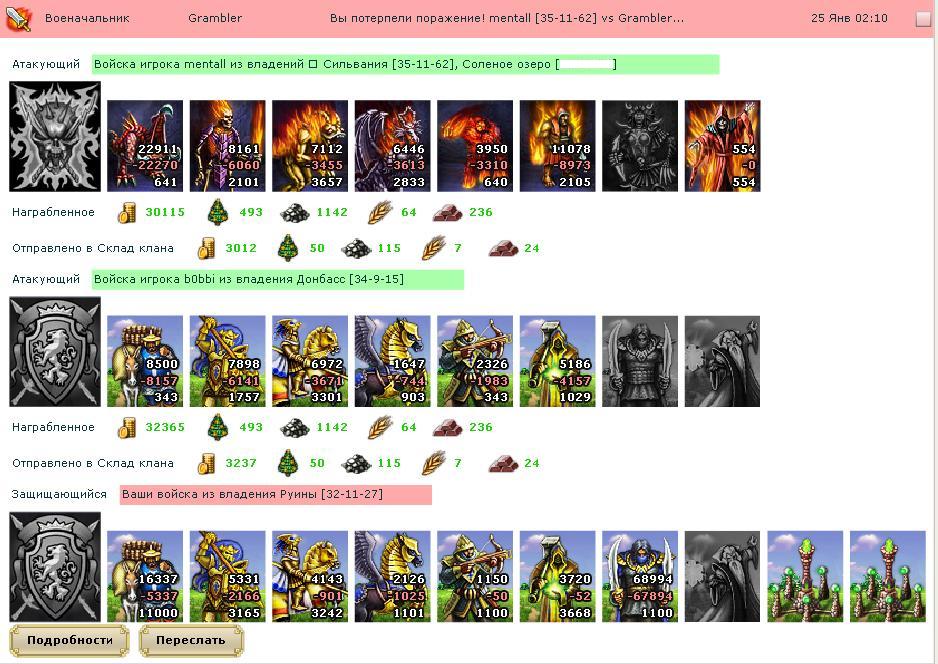 Более интересно, что предшествовало этому бою. Нам надо было показательно занулить топа из клана противников, причем размер армии топа составлял практически столько сколько все армии нашего клана вместе взятые. Армию на защите за чж и 57% ресуректа не было смысла ломать - пирова победа ... мы решили ловить его в атаке ... расчет был на то, что противники решат, против лома в виде пробоя и основы такого размера нам ловить нечего ... надо было заставить их проатачить, тогда мы могли маневрировать малой армией на бонусах и иметь воскрешалку, а они нулились ... вариант нашелся, озеро принадлежавшее соклановцу топа-жертвы ... мы бросили рядом с ним города на родном для рыцарей террайне, поставили маг башни начального уровня, защиту за чж ... фишку с прикрытием наймов основой от пробоя придумал мой коллега по клану dim2005 и должен был занулить армию ментола еще за несколько дней до вышепоказанного боя, когда мы "подставляясь" под ловлю перегоняли армии во вновь созданные города, но за 2 минуты до атаки ментол повернул и нам пришлось дальше его выдергивать ...