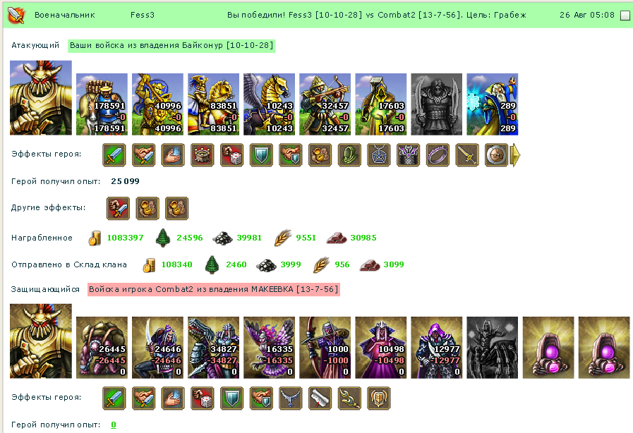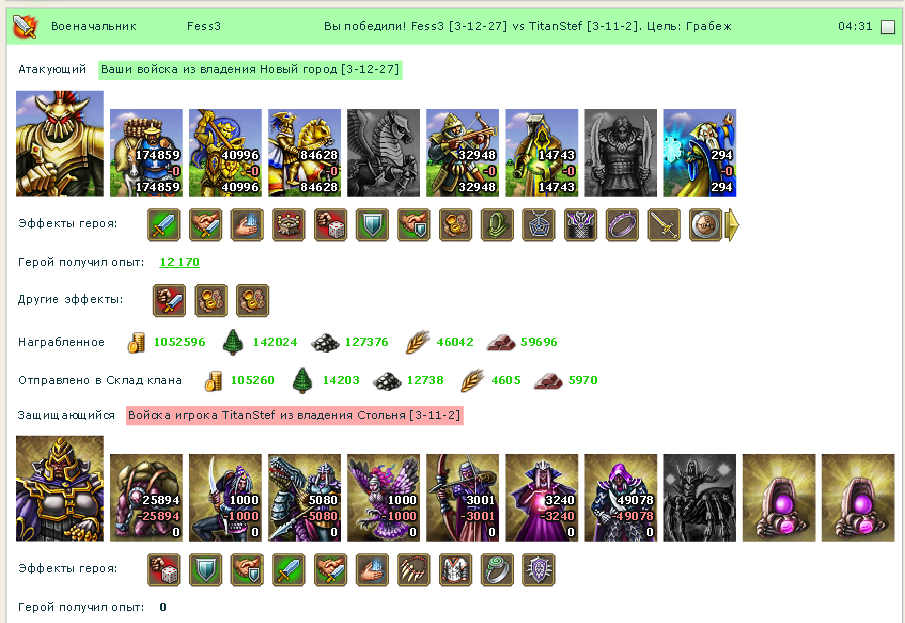 Как-то клан скинул отчёт руины, на которую идёт сосед. "А почему бы и нет?" - подумал я... Учитывая сопоставимую мощь имевшихся в наличии армий приходилось пустить в бой самый лучший обкаст, который у меня был - в том бою у меня было 60 защиты. Атакуемый решил, что лучшим выходом в данной ситуации будет вытащить всех ножей и поставить отступление в 100%. :no: Результат ниже.
