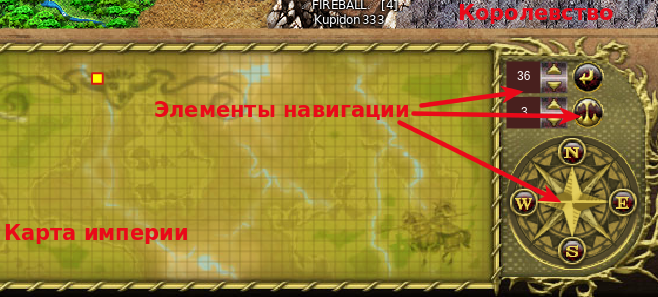 Координаты королевства в империи задаются двумя цифрами, например, 36-11. Третье число координаты обозначает поле в королевстве. Чтобы перейти в королевство с такими координатами - воспользуйтесь элементами навигации. Королевство с Вашим текущим владением обозначено на карте империи красным квадратом. Королевства со всеми остальными Вашими владения выделены желтыми квадратиками.