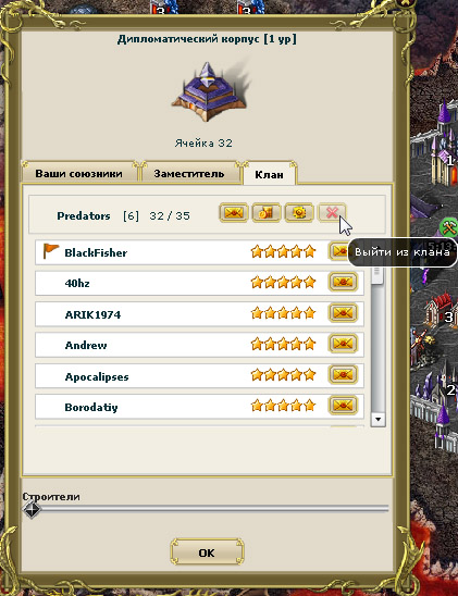 Глава клана может удалить игрока из клана. Для этого в Дипломатическом корпусе на закладке Кланы нужно щелкнуть на имени игрока, и в открывшейся панельке нажать кнопку "Удалить игрока из клана". Игрок выйдет из клана не сразу, а через 1 день, после отсчета обратного таймера.