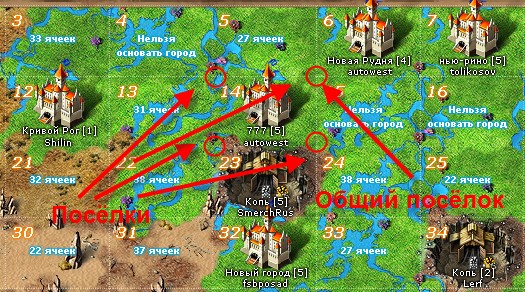 ПРИМЕР: На рисунке у города в клетке 14 (777) общие поселки с городом в клетке 6 (Новая Рудня)